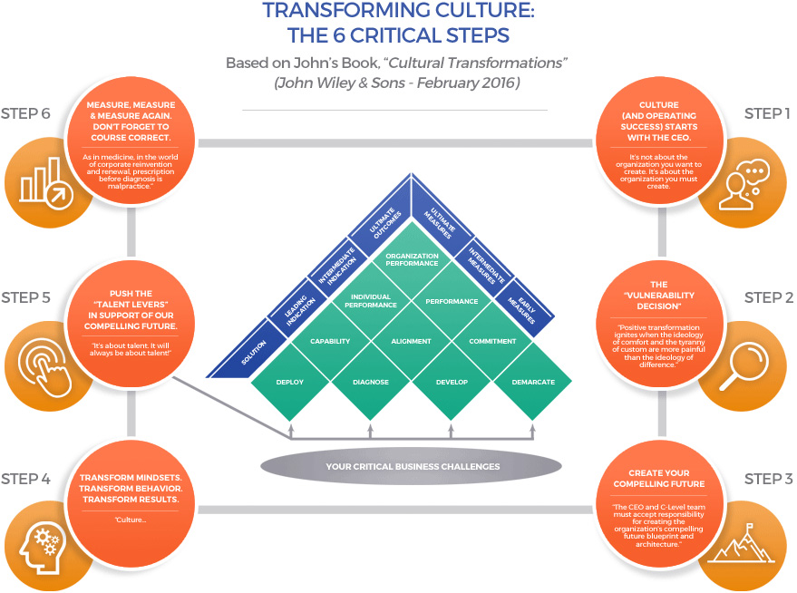(1) create a culture that truly supports your most pressing operating imperative; and (2) continuously determining if you in fact have created this culture and, if not, quickly and decisively course-correcting to ensure this goal is met. These are the two most important jobs of a CEO, owner, entrepreneur, and their senior executive teams. The infographic below, Transforming Culture: The 6 Critical Steps, highlights the steps to help you and your organization successfully navigate your transformation challenges.